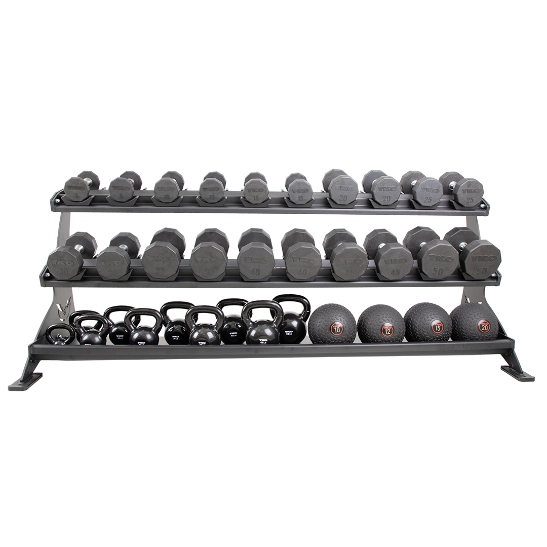Shelf Options: Each tier can be either a saddle or tray rack (for dumbbells).